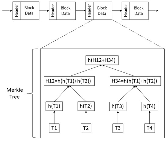We can now discuss the basic blockchain depicted in Figure 2. Individual transactions (blocks T1 through T4) are first combined into a “block” that will be added to the blockchain. To do so, the transaction data are hashed, and then the hashes themselves are concatenated and hashed again in a tree pattern until only a single hash remains (technically, this is known as a Merkle tree [31]). This Merkle tree can be efficiently used to prove the integrity of any of the original transaction blocks; it and the transaction blocks form the block data.
