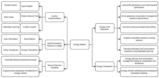 Li et al. [95] propose a framework with four permissioned BCs, responsible for market initialization, energy trading, state estimation, and market settlement, respectively. The market initialization BC includes SCs automating the network and market rule configuration. The energy trading BC runs the energy auctions. The state estimation SCs share data, including operating states at participants’ physical boundaries, and estimate the system operating state for energy transfers. The market settlement BC coordinates financial settlement and participants’ reputation scores. The framework coordinates the various SCs to allow for a market without third parties or trust between energy market participants. For example, the market settlement BC communicates with the market initialization BC to receive the pseudonym of each transacting microgrid and the power network configuration to settle scheduled and actual energy transfers.