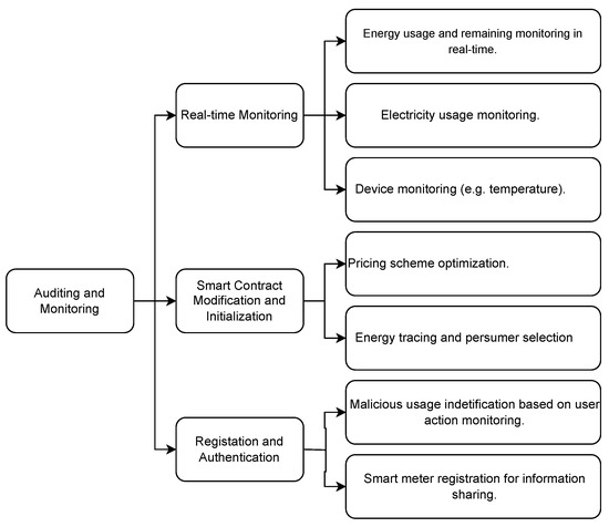 SCs can monitor devices, users, and data to detect malicious behavior or prevent threats to the system. Auditing refers to SCs tracking energy usage in real-time, initiating contracts, or auditing user preferences such as price, time, etc. Monitoring applications include Gao et al.’s [14] proposal to identify malicious usage of electrical power and data. Li et al. [77] design a distributed renewable energy system for residential, commercial, and industrial users; SCs are used to maintain stability even under such different load profiles. Yang et al. [16] allow residential consumers to track power usage and interior air temperature and to purchase additional power when needed. Yuhong Li et al. [9] allow consumers to trace the generation of consumed energy and form SCs to select generation sources of their choosing. Monitoring often involves Distributed State Estimation (DSE) using asynchronous data; delays in data transfer can negatively affect DSE. Asefi et al. [78] utilize an SC to improve delayed-delivery tolerance in DSE.