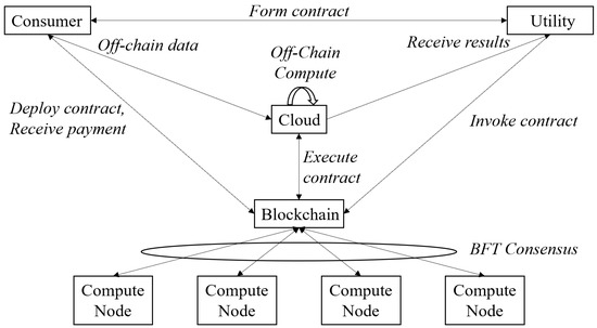 In Figure 6, a utility wishes to access consumer data. The consumer will securely store his/her data in an off-chain database (assumed to be cloud-based). The utility and consumer will negotiate an SC defining the data to be provided and the compensation to the consumer. The consumer deploys this contract to the BC. The utility can invoke the SC, triggering a (third-party) cloud-based off-chain computation involving the consumer’s data. Only the result of this computation is returned to the utility, and the consumer is paid [7]. Another approach to securing raw data is to deliberately add noise to the data, as in Gai et al. [80].
