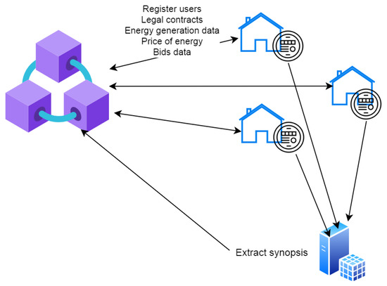 SCs can also collect and record necessary data in the ledger. Such data are commonly generated off-chain and may come from prosumers, utility companies, etc. The data may include selling price and amounts of energy, auction bids, closed bid data [4,5], user energy profiles [9], user satisfaction [36], generation information, demand information [37,38], and smart-meter readings [39,40].