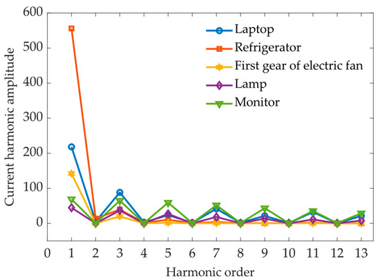 As a higher frequency and dimension frequency domain characteristic, harmonics can contain more load information. Figure 3 illustrates the current harmonic amplitude of a sampling point when some devices run individually, while Figure 4 shows the current harmonic amplitude of a sampling point when some electrical appliances are run in combination.