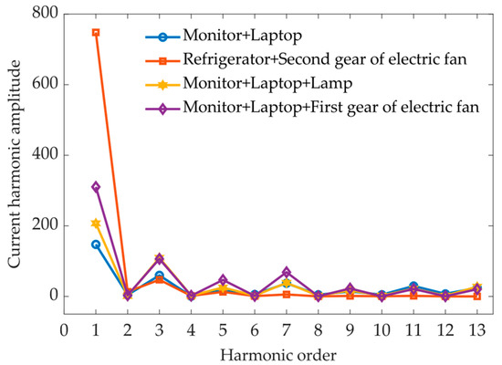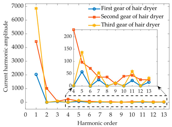The amplitude of odd-order harmonics is typically larger than that of even harmonics generated by electrical appliances, and even harmonics are generally close to 0. However, experimental measurements revealed that, when the hair dryer is running in the second gear position or in combination with other equipment, the amplitude of even harmonics becomes larger. Figure 5 illustrates the harmonic amplitude of the hair dryer’s three gear positions.