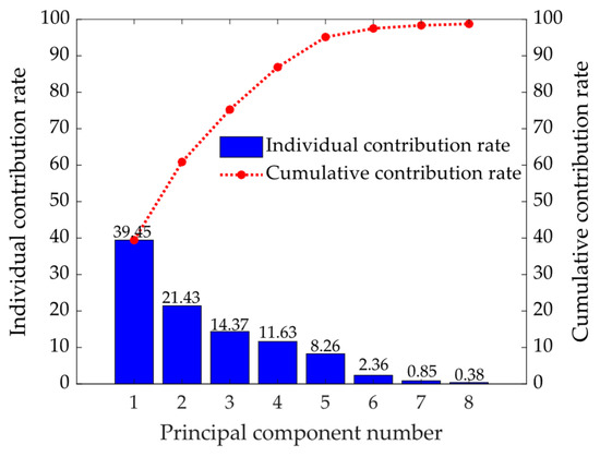 Based on Figure 6, the first five principal components contribute the most to the extracted features, with contribution rates of 39.45%, 21.43%, 14.37%, 11.63%, and 8.26%, respectively. The cumulative contribution rate of the first five principal components is 95.14%, which is more than 95%. In contrast, the last three principal components only have contribution rates of 2.36%, 0.85%, and 0.38%, respectively, resulting in a cumulative contribution rate of only 3.59%. Thus, it is concluded that the first five principal components are sufficient to represent all the feature information.