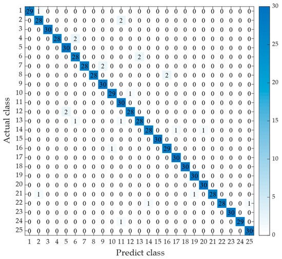 (3) The KPCA-IGWO-RF model was constructed using the MATLAB R2020a platform. After training with 1500 sets of data representing 25 types of load labels, simulation tests were performed on 750 sets of data to determine the accuracy of load identification. The classification performance of the KPCA-IGWO-RF model was evaluated through the generation of a confusion matrix, as depicted in Figure 7.