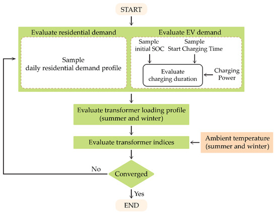 Figure 1 shows the proposed method to quantify the impacts that long-range and short-range EVs’ charging demand cause on transformer life. The Monte Carlo Simulation is used to consider model uncertainties [20]. First, residential and EVs’ demand are sampled according to probabilistic models developed based on real data. Then, the transformer load is computed for summer and winter, accounting for residential load and EVs’ charging demand. Based on transformer demand and ambient temperature, transformer indices are evaluated for summer and winter to estimate its loss of life.
