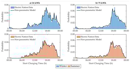 Histograms of Start Charging Time and PDF models for different battery capacities. (a) 24 kWh. (b) 75 kWh.