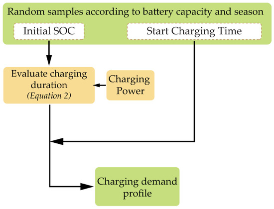 The EV charging demand profiled is obtained for a period of 24 h with 10-min resolution according to the flowchart shown in Figure 5. Two EV models are considered varying the EV battery capacity and the charging power level: