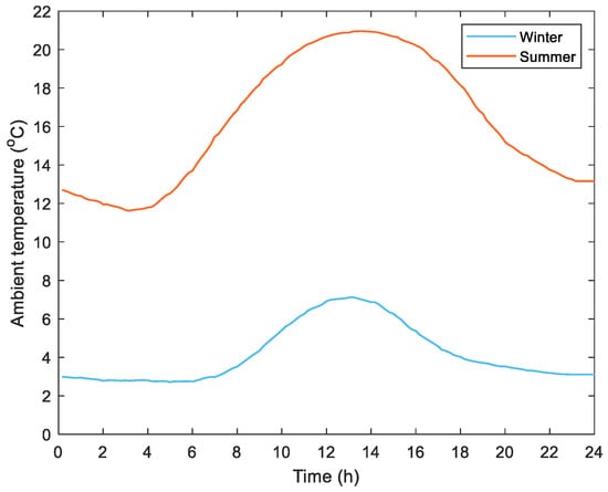 The ambient temperature is an important parameter in determining the transformer’s load capacity. This paper adopted ambient temperatures’ curves over a period of 24 h, with average values extracted from the National Solar Radiation Database [22] for the location of the United Kingdom. Two curves are considered as shown in Figure 6, one for summer season and the other for winter season.