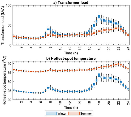 Boxplot for 24-h period. (a) Transformer load. (b) Hottest-spot temperature.