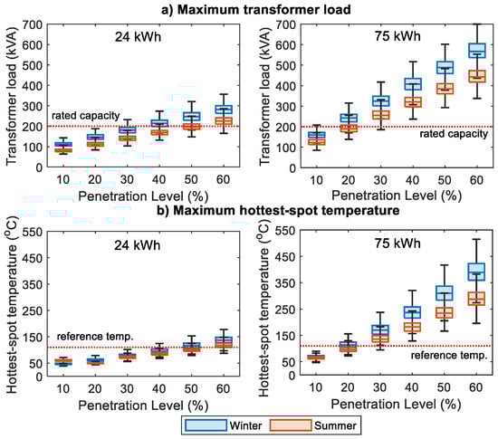 Figure 8 shows the boxplot of maximum transformer load and hottest-spot temperature to each penetration level. During winter, residential demand is higher and transformer violates its rated capacity limit for lower penetration levels compared to summer. Also, the impacts caused by EVs with 75 kWh batteries are more severe because they charge at higher power levels, increasing peak demand. The total load already exceeds transformer-rated capacity for penetration levels of 20% in both winter and summer with long-range batteries.