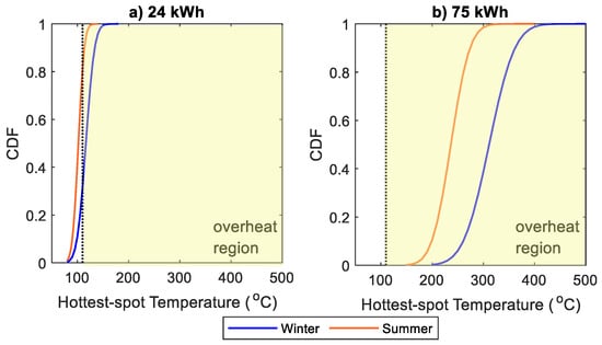 Figure 10 shows the cumulative distribution function of transformer hottest-spot temperature, and the same behavior is observed. The worst scenario is when using vehicles with higher battery capacity during the winter season. For vehicles with 24 kWh, the probability of transformer hottest-spot temperature achieving values above the reference temperature of 110 °C is 64.5% during winter and 17.6% during summer. For vehicles with battery capacity of 75 kWh, the probability increases to 100% for both winter and summer seasons. The main factor that affects the transformer is its insulation temperature, which in turn is mainly related to overload operation and exposure to high ambient temperatures. Since the ambient temperature at this location (England) is not very high during summer season (maximum of 21 °C), transformer operating life is mainly affected by load, which is higher during winter.