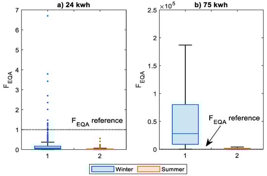 Boxplot of transformer equivalent aging factor (FEQA). (a) 24 kWh. (b) 75 kWh.