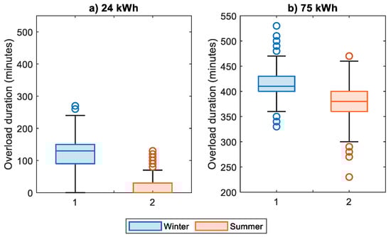 Boxplot of transformer daily overload duration. (a) 24 kWh. (b) 75 kWh.