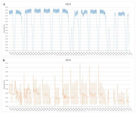 Figure 3A,B, as an example, describes the variation in pumping rate and reinjected water temperature during the 2016 summer operation period of the Politecnico di Torino GWHP (Piedmont Region, north-western Italy). The reported values were recorded in correspondence with the Politecnico di Torino GWHP injection well (P4) using a multiparametric probe which records hourly values for both injection rate (Q) and water temperature variation (T). Q and T parameters fluctuate weekly (with a Monday-to-Saturday weekly cycle) and daily (with a 7 a.m. to 6 p.m. daily cycle) depending on energy demand during each summer-operation period. As shown in