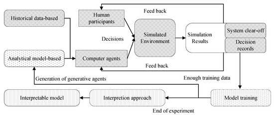 HEL mainly consists of three modules: a human–machine hybrid experiment, a generative model, and an interpretation approach [25]. As shown in Figure 2, participants in hybrid experiments include humans and computer agents. Human participants need to understand how the mechanism works, calculate profits, determine decision ranges, and anticipate potential transaction outcomes. During the experiment, all participants are required to maximize the profits of the roles they represent with a serious attitude. Computer agents are divided into two categories: based on historical data and based on experimental data for training generative models. Agents based on historical data are driven by actual historical data and act as experienced exogenous participants, participating in hybrid experiments with humans in a certain proportion. Generative models generating agents on the basis of experimental data should not join in the first round due to a lack of data. The training data for generative models mainly come from human participants and are adjusted with a small amount of actual data.