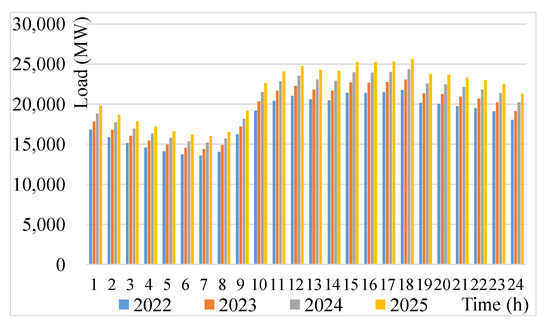 According to the characteristics of the Shenzhen power grid, the Shenzhen regional power transmission network model was constructed according to the 14th Five Year Plan of China. The market clearing model can be solved by PROPHET software. Various parameters such as the load, upper limit of generation output, and solar output are substituted into the established Shenzhen regional grid framework of different years. The 2022–2025 typical daily load of the Shenzhen area is shown in Figure 3, and the load data came from the real data of the nonpublic database. Each unit is optimized and dispatched in the spot market, and then the optimization results, including real-time scheduling strategy, node electricity price, and generation output, can be obtained. Through the simulation analysis of the current planning scheme, it can be verified whether a reliable power system operating state can be maintained under the spot market-oriented environment. The basic parameters of the system are shown in Table 1. In order to verify the effectiveness of the current planning scheme, the following cases are designed: