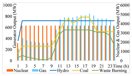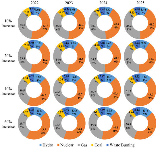 In Case 3, as the prices of natural gas and coal energy increase, the bidding prices of the generated units also increase, and the changes in output proportions of different units in different years are shown in Figure 10. Generally, the output proportions of gas-fired and coal-fired units show a decreasing trend as the bidding prices increase, while the output proportion of hydroelectric units shows an increasing trend, and the output proportions of nuclear and waste power plants fluctuate little.
