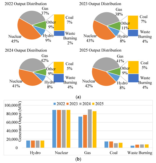 The operating results of the system in Case 1.1 in each year are shown in Figure 4. It can be seen that the output of nuclear power and hydropower has remained stable in each year due to relatively low marginal costs. The output of other types of generators is similar to the overall load curve, with a clear peak-to-valley gap. In addition, the output ratios of generators for each year are shown in Figure 5a,b. It can be observed that the output of nuclear and hydro power has remained stable over the years. Moreover, the coal-fired electricity generation will show a decreasing trend from 2022 to 2025, while the trend of the gas generator power output will be opposite. This is due to the coal-to-gas project conducted in Shenzhen and the continuous commissioning of new gas-fired power units. Overall, the Shenzhen power system can still maintain a relatively high proportion of clean energy output in the spot market environment; even with the increasing load, it can still reduce the output ratio of high-energy-consuming coal-fired power units through methods such as coal-to-gas conversion.