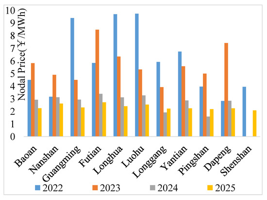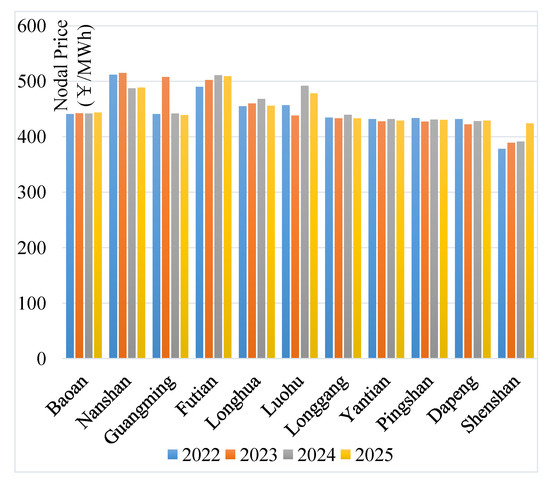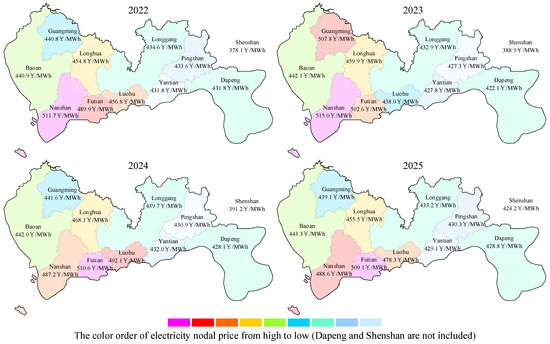 Meanwhile, the geographical distribution of nodal electricity prices in different years shown in Figure 7 clearly corresponds to the distribution of loads in Shenzhen. Nanshan, Futian, and Luohu districts have relatively dense populations and concentrated electricity loads, resulting in higher nodal electricity prices in these areas. In addition, average nodal electricity prices in Guangming, Baoan, and Longhua areas are generally higher than those in Longgang, Pingshan, and Yantian areas. Overall, there is a clear trend of higher nodal electricity prices in the southern and eastern areas of Shenzhen compared to the northern and western areas.