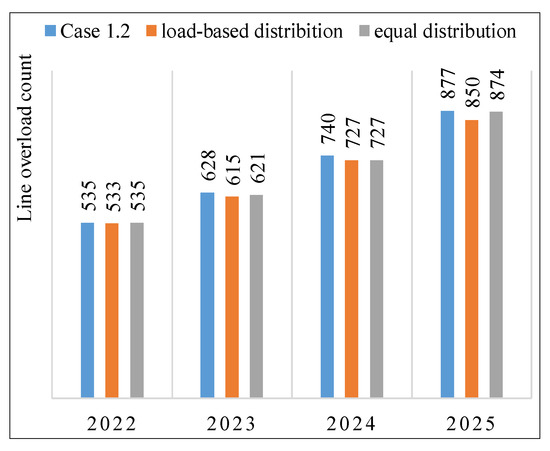 Table 2 presents the node electricity prices in different regions of Shenzhen under different PV distribution scenarios in 2025. Due to the low proportion of PV installed capacity in Shenzhen’s total installed capacity and the relatively low level of PV capacity until 2025, the impact of different scenarios on node electricity prices is not significant (about 5 CNY/MWh). The impact of different PV allocation methods on node electricity prices is also negligible. Therefore, this paper adopts the line overload frequency as another indicator to measure PV distribution methods, and the comparison results are shown in Figure 8.