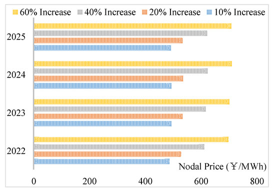 The changes in the city-wide average node electricity prices in each year due to bidding price fluctuations are shown in Figure 11. It can be observed that the fluctuations in unit bidding prices have a significant impact on node electricity prices, with a clear increase in city-wide average node electricity prices as the proportion of bidding price increases. This indicates that, under the current planning strategy, it is difficult to maintain stable node electricity prices when bidding prices increase due to changes in unit fuel costs. It is suggested that the situation could be improved by increasing the installation proportion of low-marginal-cost new energy sources such as solar and wind power.