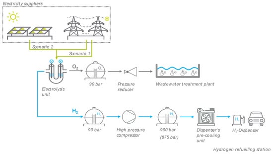 In this study, hydrogen and oxygen were produced on site at a WWTP in Thuriniga, Germany by electrolysis using grid electricity (Scenario 1) or PV electricity generated in-house and supplemented by grid electricity (Scenario 2). In this way, climate-neutral hydrogen for fuel cell electric vehicles (FCEV) could be produced directly at the HRS (publicly accessible). Oxygen could also be used directly in the biological purification stage of the WWTP after intermediate storage (see Figure 1). Onsite electrolyzers offer the great advantage that the refueling station, as well as the aeration basin, is independent of hydrogen or oxygen supplies, transport costs are eliminated, and the investment costs remain low. Before the hydrogen can be delivered to a vehicle, it must be compressed to the required pressure. The aerator for pure oxygen only works at an operating pressure of approximately 2.5 bar [32]. Therefore, the gas can be depressurized from 90 bar before it Is introduced into the aeration tank of the WWTP. The hydrogen and oxygen storage tanks are bundle battery plants in a modular system. This makes it possible to expand existing plants without any problems. The hydrogen refueling station consists of a high-pressure compressor, a dispenser’s precooling unit, a remote monitoring system, a regulation and control system, and H2 dispensers [55].