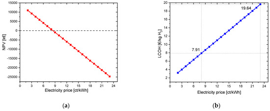 Variation in electricity price for a project lifetime of 30 years: (a) change in net present value (NPV); (b) change in LCOH values.