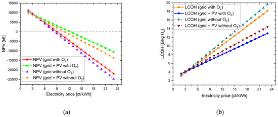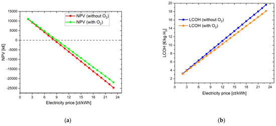 Variation in electricity price for the energy system with oxygen use for a project lifetime of 30 years: (a) change in NPV; (b) change in LCOH values.