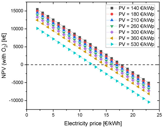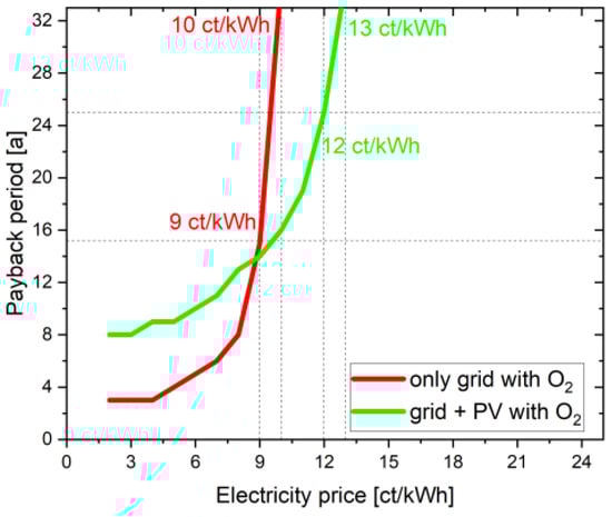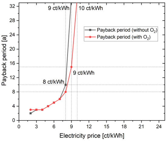 In addition to the NPV and the LCOH, the payback period is another interesting parameter to consider. In Figure 4, the payback time of the two cases, with and without oxygen consideration, is listed depending on the electricity price. At an electricity price of 23 ct/kWh, the project duration of 30 years is not sufficient to amortize the project investment. The value here is well over 32 years. In the case with oxygen, the payback period is 15 years at an electricity price of 9 ct/kWh (see above). In order to amortize the investment even in the case without oxygen use, an electricity price of 8 ct/kWh is required. The payback period is 10 years. The strong dependence on the electricity price becomes clear here. A lower electricity price results in the two cases differing less. This can also be confirmed by the NPV and LCOH curves of the two cases, with and without oxygen utilization. Unlike the linear curve in the case of NPV and LCOH, the curve here is exponential because electricity price now plays the major role in the complete project lifetime; a slight change to 1 ct/kWh results in a huge change of operational costs every year. Until 10 ct/kWh, NPV is linearly negative, resulting in a payback period of over 30 years. There is a linear decrease in NPV from 23 ct/kWh to 10 ct/kWh; however, the payback period remains above 30 year threshold. For a configuration with O2 at 9 ct/kWh, the NPV achieved is 116.81 kEUR after the 30 year project lifetime; however, in the 15th year of the project, the NPV is 0 EUR, and the project subsequently earns profit from hydrogen and oxygen sale. Similarly for other points/electricity prices, the payback period is achieved at quickly and the NPV increases linearly every year after this stage. Hence, the payback period curve becomes exponential at each point after break-even is achieved.