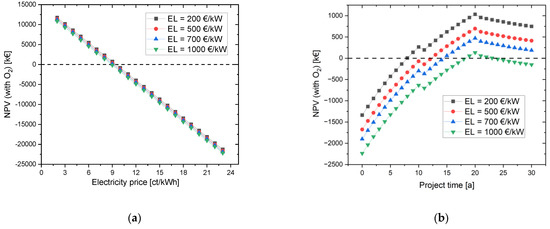 In order to additionally investigate the influence of the electrolyzer CAPEX (EL) on the NPV, the simulation with oxygen use was selected as the initial scenario. If the NPV is plotted against the electricity costs (see Figure 5), there is hardly any difference between the simulations with initial costs of the electrolyzer of 200 EUR/kW to 1000 EUR/kW. With a CAPEX of 1000 EUR/kW, the investment in the project is worthwhile from an electricity price of 8 ct/kWh and lower. For the simulation with an electrolyzer CAPEX of 200 EUR/kW to 700 EUR/kW, the marginal electricity price is 9 ct/kWh. A special case exists for EL = 1000 EUR/kW; here, the NPV reaches a positive value in the 19th and 20th years and then becomes negative again. This is due to the fact that several expenses are due in the 21st project year, such as the stack exchange, new contract for the long-term rental of the hydrogen and oxygen storage tanks, and inspection of the HRS.