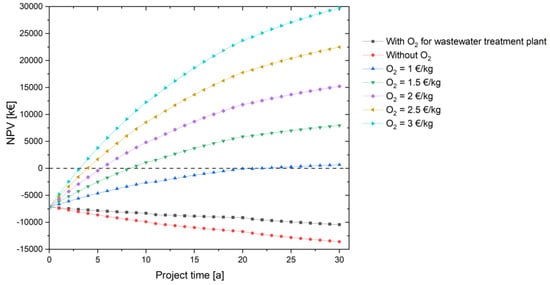When the same settings are applied, but oxygen is additionally used for the biological purification stage, there is a slight improvement in the NPV, but it still remains negative: −21,902.37 kEUR. The main reason is that the oxygen is not directly sold to the WWTP in kg; instead, it is used to save only minor electricity costs of the aeration blower inside the WWTP. With high oxygen feed-in, the revenue from the electricity savings in WWTP is very low in this case even for an electricity price of 23 ct/kWh. However, for an electricity price of 9 ct/kWh, the NPV becomes positive. The LCOH here is 8.16 EUR/kg, and the payback period is 15 years. In order to establish comparability with the simulation in Section 4.1.1.1, the electricity price was also set at 8 ct/kWh. Accordingly, the LCOH becomes 7.44 EUR/kg H2 and the investment is amortized after only 8 years. Figure 3 shows the increase in NPV and the reduction in LCOH through the additional use of the byproduct oxygen from water electrolysis.