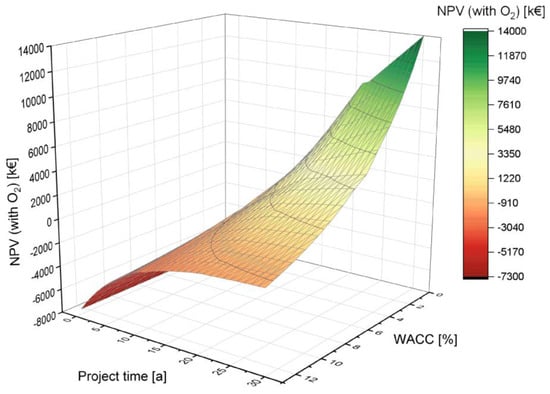 All setting parameters can be found in the tables in the appendix (see Appendix A). First, Scenario 1 is discussed, which considers a PtG system that operates only with grid power. Here, a distinction is made between a pure hydrogen application and an additional use of the byproduct oxygen. This is followed by an examination of Scenario 2 with its own PV system, which must be procured at the beginning of the project, in addition to supplying the electrolyzer with grid electricity. At the end, building on Scenario 2, it is analyzed how the sale of oxygen affects the NPV and what influence the WACC has on the result. The whole project time is based on the lifetime of the PV system. The LCOH values with and without oxygen-sided configuration are mentioned in Table 4. The best scenario is achieved for the energy system scenario with a PV powerplant and usage of the byproduct oxygen. This scenario performed well with an LCOH value of 6.28 EUR/kg H2. When compared to the selected literature values researched, which are mentioned in Table 1, the water electrolyzer energy system performed the best due to the additional sale of the byproduct oxygen for the wastewater treatment plant.