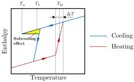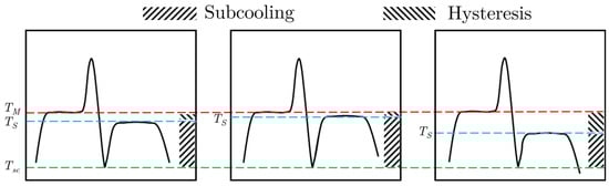 However, PCMs are rising above the most suitable solutions to control temperature and heat release in heat transfer systems, such as heat sinks and thermal storage systems. Numerical modelling of these materials is well established, and various experimental analyses on their usage for thermal management or latent heat storage have been carried out []. Most of these approaches are based on 1D or 2D modelling [,], and little effort has yet been made for 3D models due to their high nonlinearities and computational times []. As regards 1D and 2D models, the most used ways to describe the phase transition are (i) enthalpy–porosity method; (ii) apparent heat capacity method; (iii) source-based method []. These approaches can reveal significant discrepancies from the experimental evidence, and the main reasons can be the temperature dependence of thermophysical properties, or the ideal shape of the step function used to model the phase transition; above all, the neglect of phenomena as subcooling and thermal hysteresis might also affect the modeling quality. When using these approaches, subcooling and hysteresis are rarely considered [] because of the model complexity. To this end, a fundamental point is the distinction between the definitions of subcooling and hysteresis. According to the subcooling, PCM requires cooling to a temperature below the theoretical solidification point before it starts to crystallize; this has an impact on how latent heat is released and used []. This translates in PCM not crystallizing at the theoretical solidification point. Therefore, the subcooling degree is the term used to describe the discrepancy between actual and theoretical solidification temperatures. On the other hand, thermal hysteresis causes the phase change material solidification temperature to deviate from its melting temperature []. Thus, PCMs have distinct enthalpy values in the same condition and melt and solidify at different temperatures []. Whenever a comparison was made between models with and without hysteresis, it was found that the poor accuracy of the non-hysteresis model in representing the melting and solidification processes of the PCM storage represents an important limitation [,]. Thus, it further emphasizes the importance of considering hysteresis effects in simulations involving PCM materials. Since heating and cooling can show different thermal behaviors because of their nucleation mechanisms, we generally refer to distinction as hysteresis. A graphical comparison of the differences between subcooling and hysteresis is provided in Figure 1, showing which temperature ranges are labelled as subcooling or hysteresis.