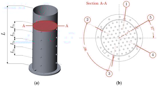 Shell-and-tube latent heat storage: (a) shell appearance and thermocouples housing; (b) cross section view, tubes displacement. Laterals (1–4) and central (5) thermocouples positions.