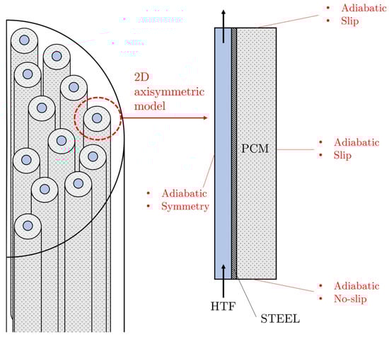 The easiest way to model the heat transfer inside PCM is to solve the energy balance alone with no inclusion of liquid PCM motion. This reduces the high non-linearities arising from the momentum equation and allows for faster convergence. On the other hand, where natural convection plays an important role—with high Rayleigh number values—this approach can lead to significant deviations from experimental results. From the initial 3D configuration, this work used the assumption of a 2D axisymmetric model to perform the thermofluidic–dynamic analysis. Therefore, the model is defined as in Figure 3.