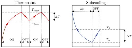 The evolution of the temperature during the subcooling can be assumed to be similar to the one that characterizes a thermostat working principle. Figure 4 resumes this analogy between an ideal thermostat and subcooling during the PCM charging phase. In control theory, an on–off controller is a form of feedback controller that changes between two states. A classic example is a domestic thermostat, which switches off/on to regulate the home temperature at a designed temperature. Thus, a temperature sensor placed within the system—which can be a room as well as a water tank—makes the thermostat (Figure 4) turn the heater on when the temperature drops below a certain lower limit, and turn it off when it exceeds an upper limit.