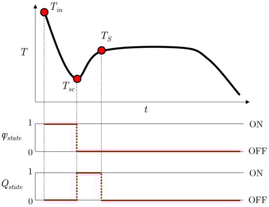 The function of φstate is to control the phase during subcooling. Thus, as depicted in Figure 6, φstate starts from an initial value of 1, and then it remains equal to 1 until the temperature does not reach the subcooling temperature Tsc. From this point, its value becomes 0 and continues to be 0 until the transient finishes, as the effect of subcooling does not occur a second time. As regards the second control variable Qstate, looking at Figure 4 one can observe a difference as it starts from 0 and continues to be off until the temperature reaches onset crystallization point (Tsc). Then, it is switched on, reaching Qstate = 1, until the nearly constant temperature section is reached (TS). At this point, Qstate needs to be deactivated. The reason why we need both φstate and Qstate is that we must maintain the two phenomena independently: indeed, the role of Qstate is just to determine how fast the temperature raises up from Tsc to Ts.