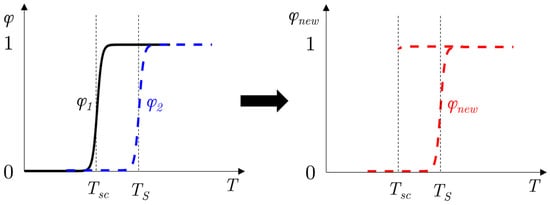 where φ1 and φ2 are the liquid fractions computed with respect to the subcooling temperature and the solidification temperature, respectively (see Figure 7). Therefore, during the cooling, φ1 is equal to 1 until the temperature reaches Tsc, and becomes 0 for lower temperatures. Likewise, φ2 stays equal to 1 until T = TS and then becomes 0. By doing so, in the first stage the PCM will follow the φ1 curve that imposes a value of the liquid fraction equal to 1 until the subcooling point is reached. As soon as the temperature drops below this value, φstate turns into 0 and the original curve (φ2) becomes the new liquid fraction curve to be followed.