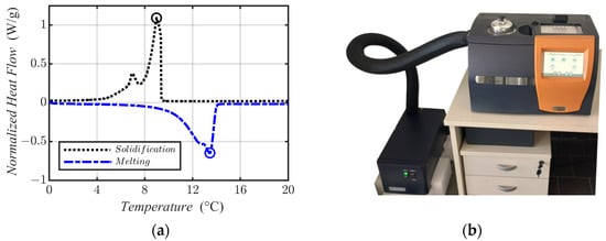 DSC analysis results: (a) normalized heat flow for solidification and melting; (b) TA Instruments DSC 250 equipment by WatersTM, New Castle, DE, USA (b).
