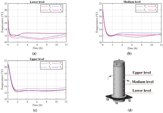 Experimental results: (a) lower level PCM temperature; (b) medium level PCM temperature; (c) upper level PCM temperature; (d) 3 levels on which PCM temperature is recorded.