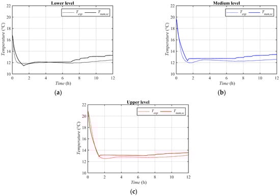 In this section, we aim to compare numerical outcomes obtained through the first subcooling model with the experimental results already shown. In detail, different from the previous figure, the experimental temperature evolutions are shown here as an average temperature for each level, i.e., a mean value for the four thermocouples’ data. This is reasonable because of the not so-high spatial deviations.