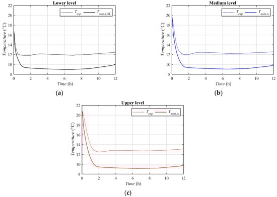 Specifically, the MAE value for each level is equal to 0.54, 0.78, and 0.58 °C, for the lower, medium, and upper level, respectively. It should be noted that these values are relatively close to the absolute value of the thermocouple accuracy, i.e., 0.5 °C, which indicates that the model results are reasonably comparable to the experimental behavior. Furthermore, this is confirmed by the values of the RSME, i.e., 0.63, 0.84, and 0.60 °C, for the lower, medium, and upper level, respectively. A further aspect to note is the sensitivity of the model to the boundary condition: for the lower level, in fact, at t = 7 h the model is much more sensitive to temperature variations than was observed experimentally. This difference tends to cancel out going up towards the upper levels. Overall, the comparison between the numerical and experimental plots showed that the numerical model accurately represented the real system. However, it is worth noting that here only one parameter has to be tuned in the subcooling model, i.e., Δtsc, set equal to 1.5 h, according to the experimental evidence; thus, the accuracy of the present prediction might be affected by this.