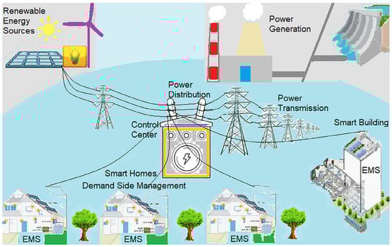 A smart grid (SG) is an improved electric infrastructure that controls, regulates, and optimizes the usage of power using digital technology. In order to increase the effectiveness, dependability, and flexibility of the electricity supply, it involves the inculcation/integration of several technologies, including SMs, RES, and ESS []. Demand-side management (DSM) and energy conservation (EC) strategies are also made possible by SG, which can help to lower the demand for power and encourage the effective use of energy. The Energy Management System (EMS) is a crucial component of DSM []. Figure 1 displays a representation of the SG, which is composed of multiple power sources, transmission lines, RES, EMSs, and a central control center [].