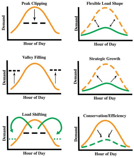 Demand-side management is a strategy that focuses on reducing the overall demand for energy by encouraging the efficient use of energy. It involves a range of measures, such as EC, and demand-side response, which aim to decrease electricity demand and enhance its efficiency []. This can be achieved through various measures, such as RT monitoring and control of all electrical appliances, promoting energy-efficient technologies, encouraging the usage of RES, and providing incentives for EC. Energy conservation, on the other hand, refers to the practice of reducing the use of energy through various measures. EC can help reduce the maximum demand of electrical distribution networks and enhance the efficacy of the electricity supply []. The implementation of DSM/EC strategies can provide a cost-effective means to attain energy security and independence, particularly in developing nations where a complete overhaul of infrastructure from TEG to modern SG may not be a feasible alternative due to its substantial cost []. Energy efficiency represents the most economical approach to cater to the expanding energy demands, while also constituting a fundamental component of sustainable development, in line with the United Nations Sustainable Development Goals (SDGs) agenda [,] DSM plays a significant role in accomplishing this objective by enabling the monitoring and control of loads, thereby facilitating improved EE. Furthermore, DSM and EC can help reduce the strain on the country’s limited resources, improve access to electricity, and promote economic growth. DSM in SG must take advantage of the latest/smart technologies such as the Internet of Things (IoT) to achieve better efficacy and reliability in SG environments []. Figure 2 shows various DSM techniques [].