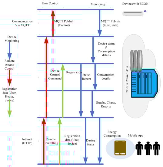 Software components include a cloud-based IoT middleware module [] and web application []. The middleware module acts as a bridge for software applications to implement communication between ECON and consumers. It acts as a connective tissue to provide the communication channel between digital devices and the middleware. DA-SoC constantly communicates the information of power consumption details to the middleware module via the MQTT protocol. It requires a very flexible and scalable data repository to store user-related details such as energy consumption, temperature, and device status. Based on temperature and per-device power usage, the collected data are filtered and categorized. Power usage trends are analyzed and predicted through these data in the form of a graph, charts and reports. This allows each consumer to see their pattern of power consumption. Consequently, the consumer/facility manager can turn the system on/off based on such information through a command. In addition, the tool will allow consumers/community managers to see the trend of energy usage as per their specific needs. These reports and graphs are provided to the client application via the HTTP protocol.
