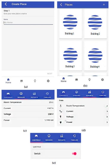 A web application helps users to communicate with the portal and to monitor home appliances remotely using IoT protocol. Figure 5 displays the main application that includes all possible choices, such as adding a place (shown as Figure 5a), tracking building appliances (Figure 5b), sensors information (Figure 5c), statistics on room temperature, current, voltage and power (Figure 5d) and obtaining RT controls (Figure 5e).