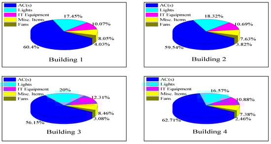 HVAC contributes a significant portion of electricity consumption in buildings and the residential sector, so in an effort to reduce energy consumption and promote sustainability, our focus is on HVAC load, as it was found to be accountable for 60% of overall energy consumption in the buildings. The electricity consumption of each building has been calculated using a conventional approach. To this end, the electricity consumption of each electric appliance in 04 buildings was listed and it was found that AC contributes almost 60% of the electricity consumption in each building, as shown in Figure 7.