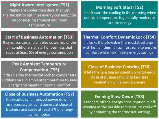 It has been observed that percentage of energy conservation is maximum during the Close of Business Automation, i.e., TS7 due to shut down of all unnecessary AC units and its minimum during the Peak Ambient Temperature Compensation, i.e., TS5 due to sudden spike in ambient temperature and disabling of thermostat lock to maintain thermal comfort. Percentage of energy conservation during Evening Slow Down (TS8), Night Aware Intelligence (TS1), Close of Business Costing (TS6) and Morning Soft Start (TS2) is 41%, 37%, 35% and 26%, respectively whereas during Start of Business Automation (TS3) and Thermal Comfort Dynamic Lock (TS4) percentage of energy conservation is 14% and 11%, respectively.