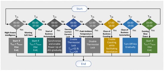 The case study was developed on multiple HVAC units in four different office buildings. Each AC unit has ECON, which collects details about power usage and the environmental situation regularly and then transmits this information to the middleware module. A time and sensors-based algorithm, as shown in Figure 9, is presented based on eight TSs. It is executed at the IoT layer and processed at the ECN layer.